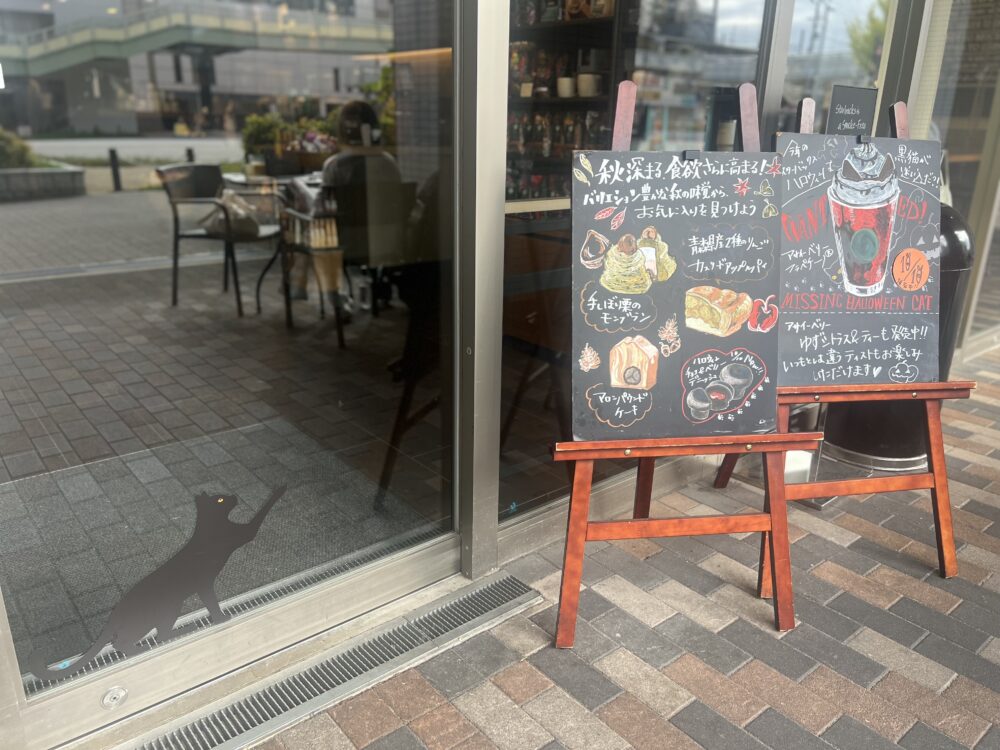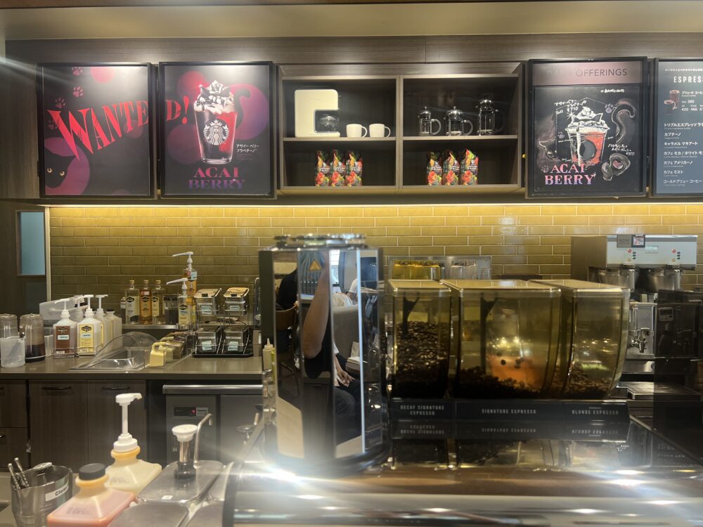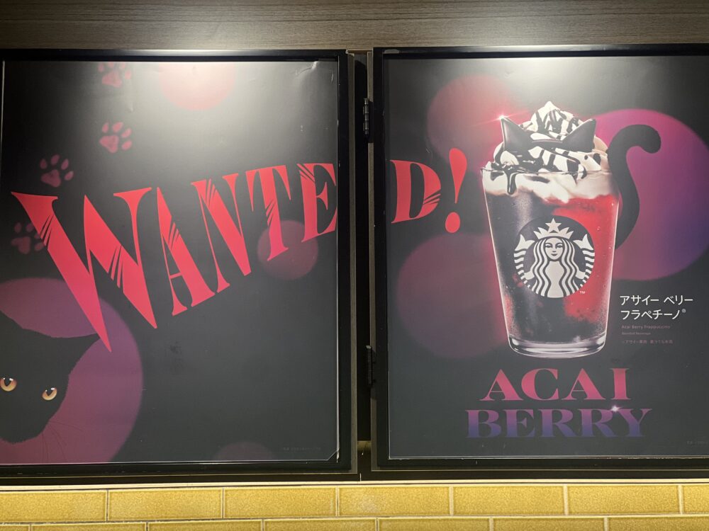 奥の棚には、「アサイーベリーフラペチーノ(通称:黒猫フラペチーノ)」のチョークアートやポスターが飾られています。