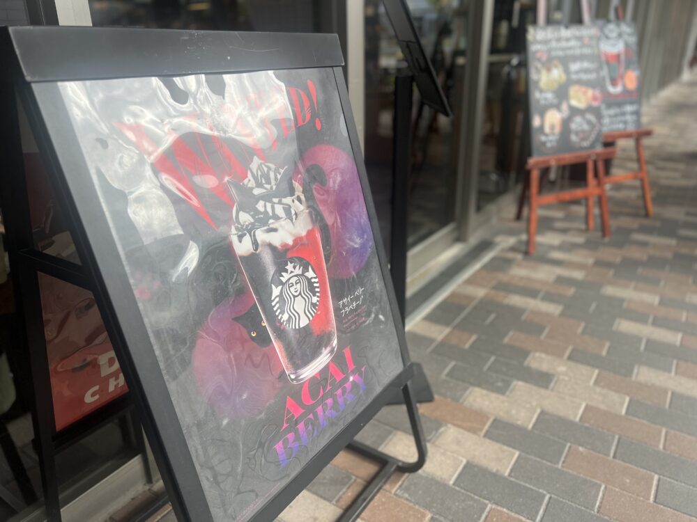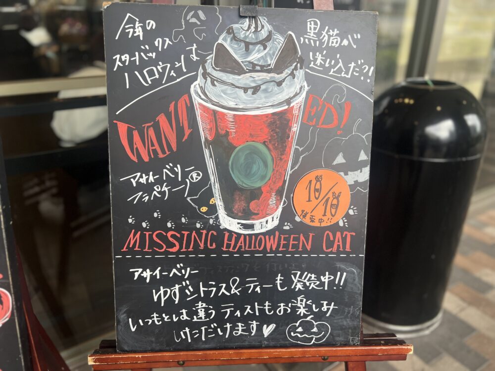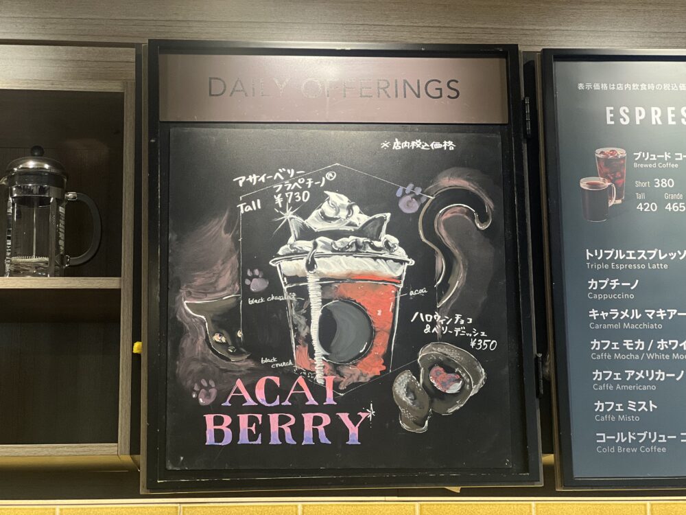 チョークアートには、「アサイーベリーフラペチーノ」と一緒に、同じく新作の「ハロウィンチョコ&ベリーデニッシュ」が描かれています。