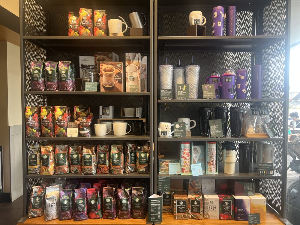 棚にはハロウィンデザインのタンブラーやマグカップなど、スタバ新作グッズが並んでいました。