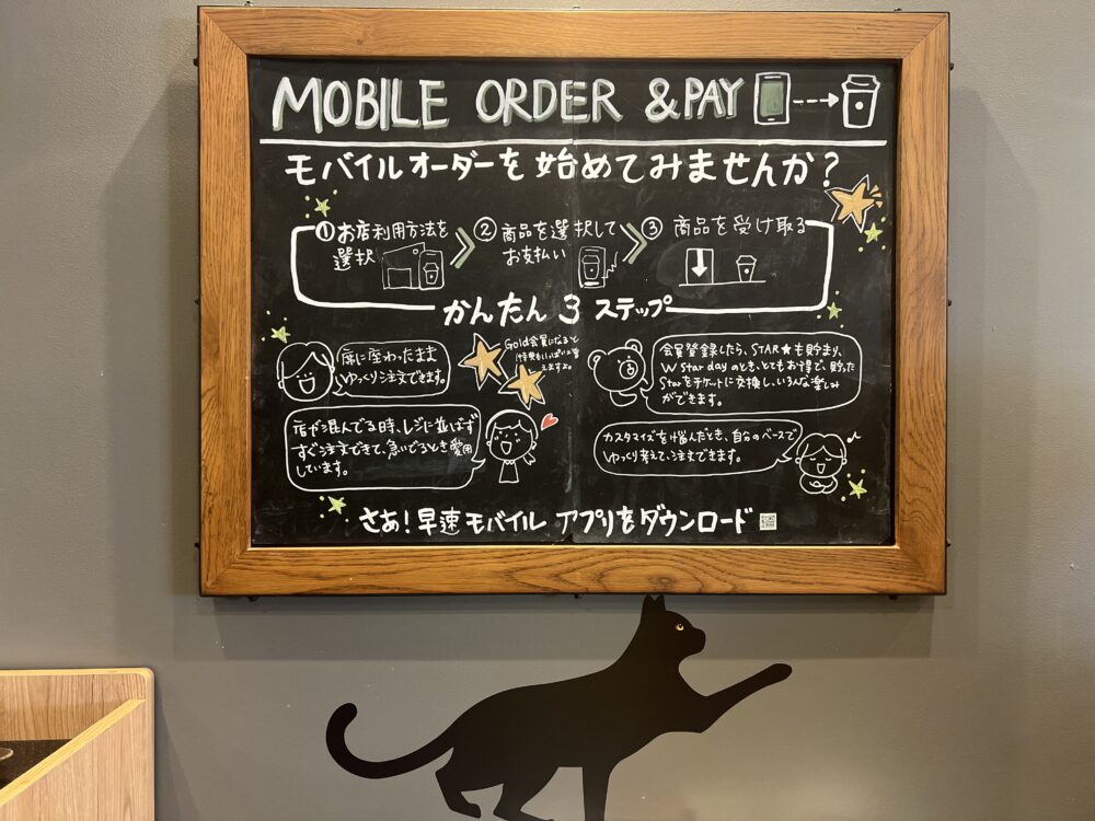 スタバアプリのモバイルオーダーについて書かれた黒板の下にも黒猫がいました!