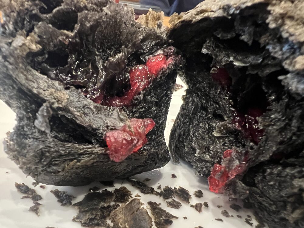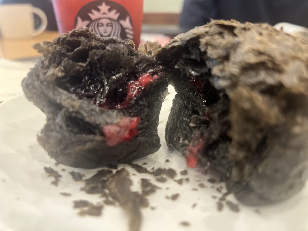 ふんわりした真っ黒なチョコレートデニッシュの中から、真っ赤なストロベリージャムがドロっと出てきました!