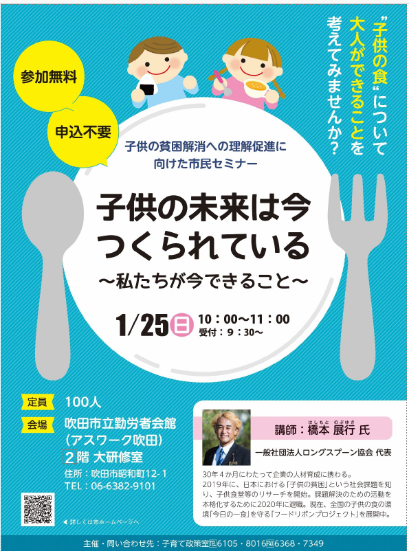 【無料・申込不要の市民セミナー】子どもの貧困解消への理解を深めよう!「子供の未来は今つくられている~私たちが今できること~」@吹田市立勤労者会館