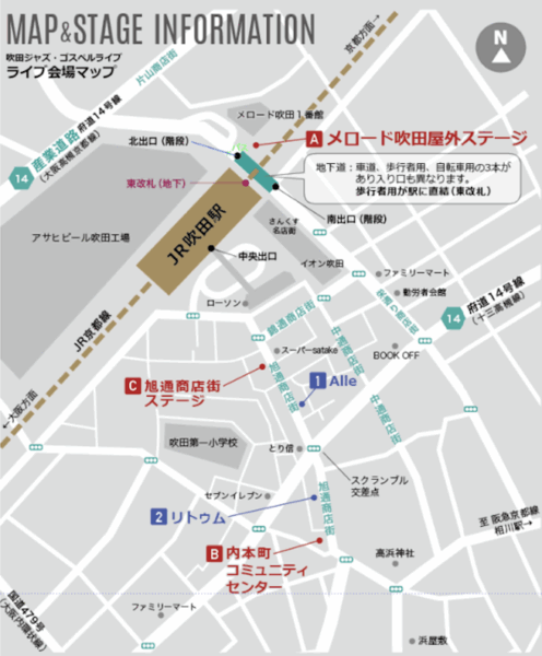 吹田の街を歩きながら、屋外ステージやカフェ、ホールで多彩なジャズやゴスペルを楽しめる今回のライブ。昼から夜まで、自分好みの音楽を自由に回れるのが魅力です。