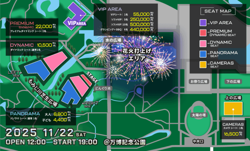 観覧エリアの違いや入場ルールを事前にチェックしておくことで、当日の移動もスムーズに。自分に合った席種を選んで、夜空に浮かぶアートを存分に楽しめそうです!