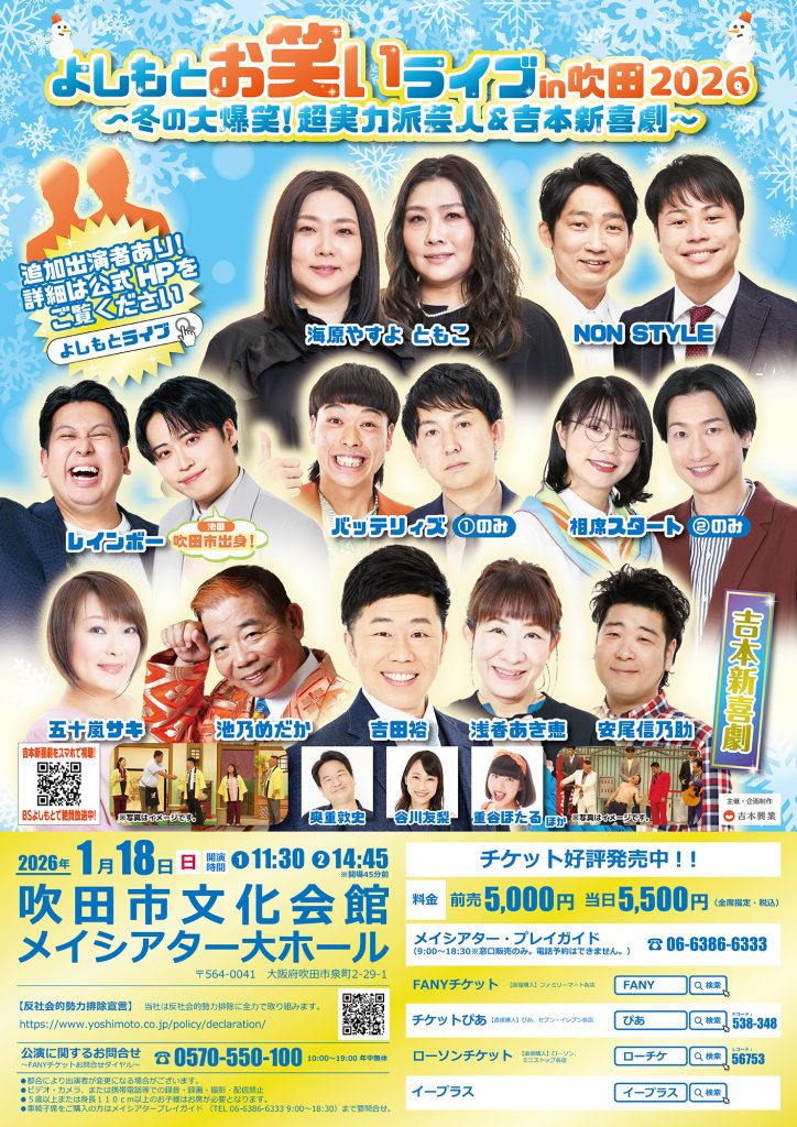 なんと!あの吉本興業から、実力派芸人さんたちと吉本新喜劇の方々が、吹田にお笑いライブをしに来るみたいですよ~☆☆(^^♪
