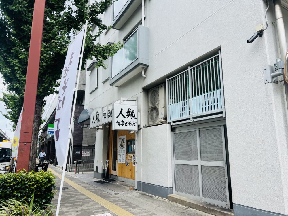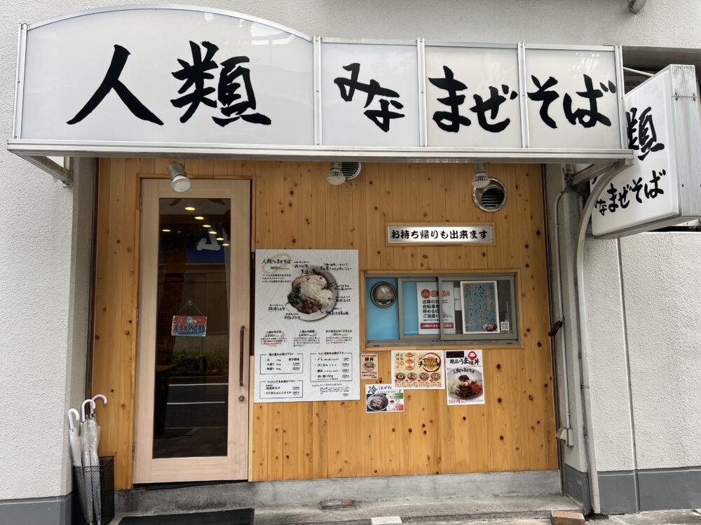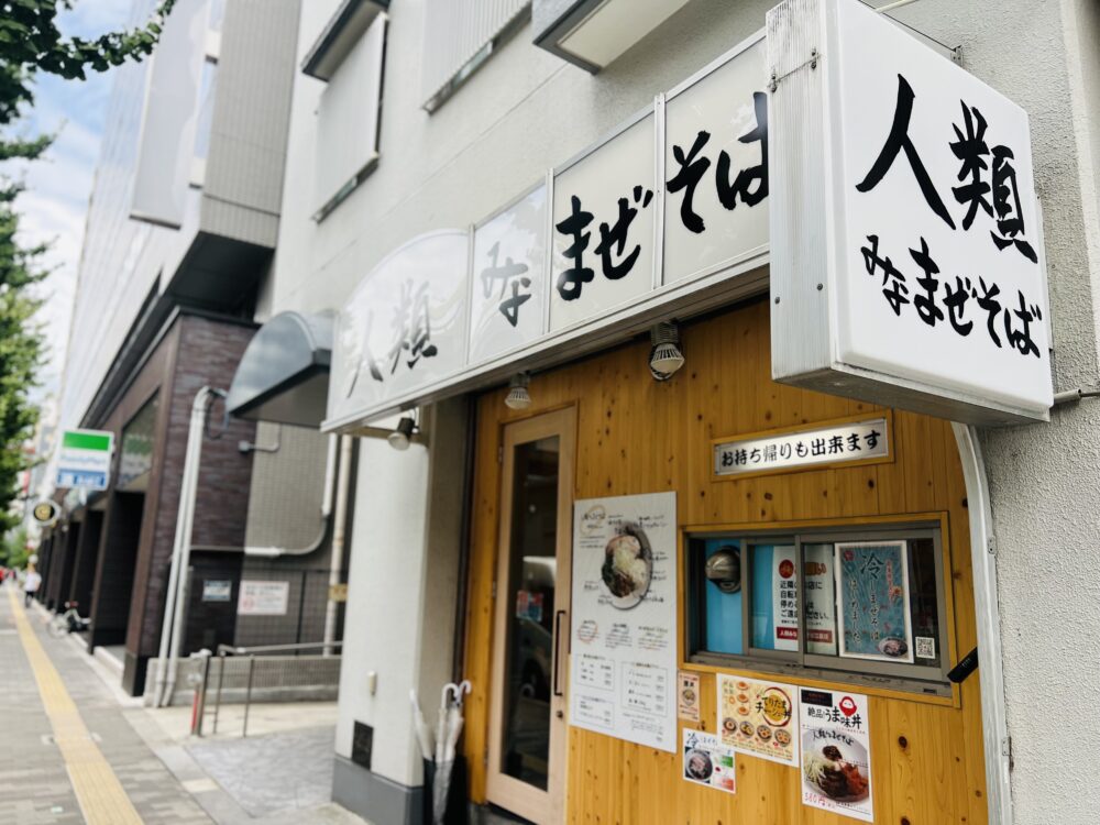人類みなまぜそば 江坂店」は、江坂駅1番出口を出て、緑地公園方面に徒歩1分ほど歩いたところにあります。