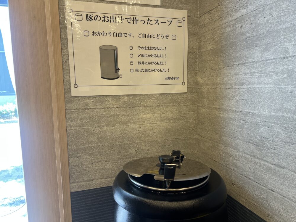 「豚のお出汁で作ったスープ」は、チャーシューを作る時に出た煮汁のことだそうで、おかわり自由みたいです。