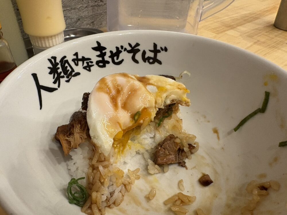 2人でシェアしているとはいえ、3品目となるとなかなかおなかいっぱいになってきたので、目玉焼1枚のせ(ご飯小盛り)をチョイス。