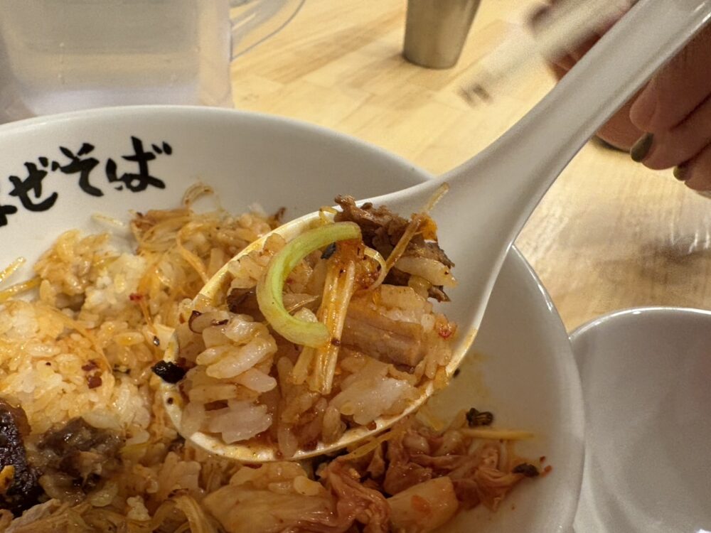 厚切りチャーシューの他、白髪ネギや玉ねぎ、ニラ、メンマが入っています。