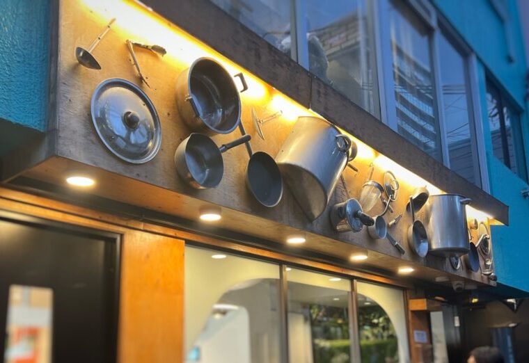 本来なら看板があるはずの場所に、鍋やトングなどの調理器具が貼り付けられています。