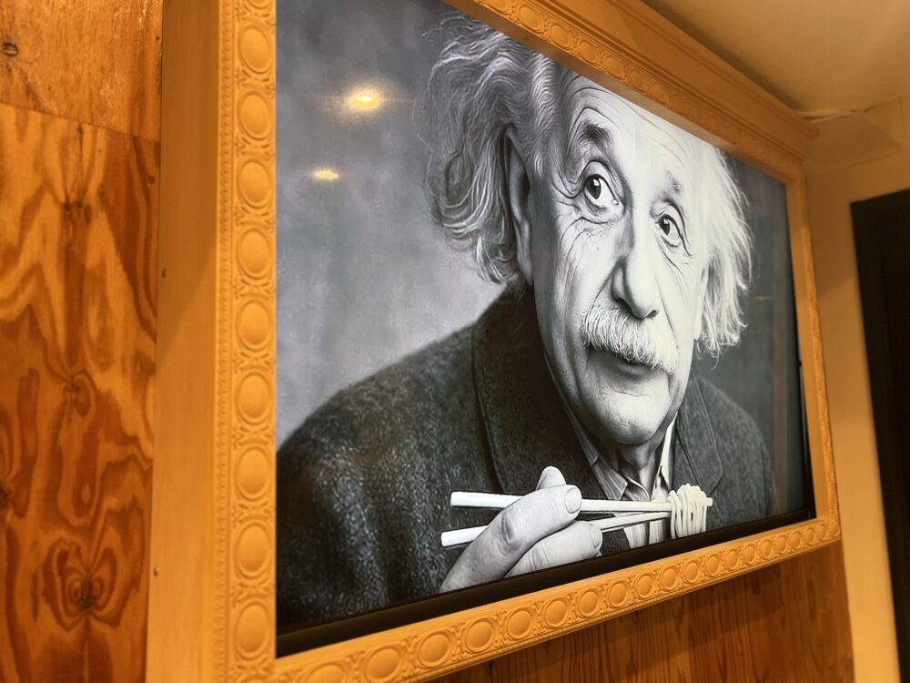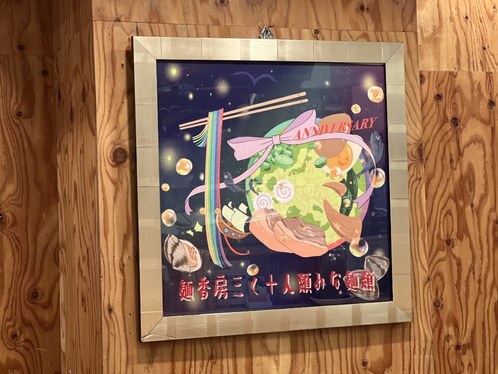 そして、もう一つ壁にかけられたパネルには、「ANNIVERSARY」と「麺香房 三く+人類みな麺類」の文字。