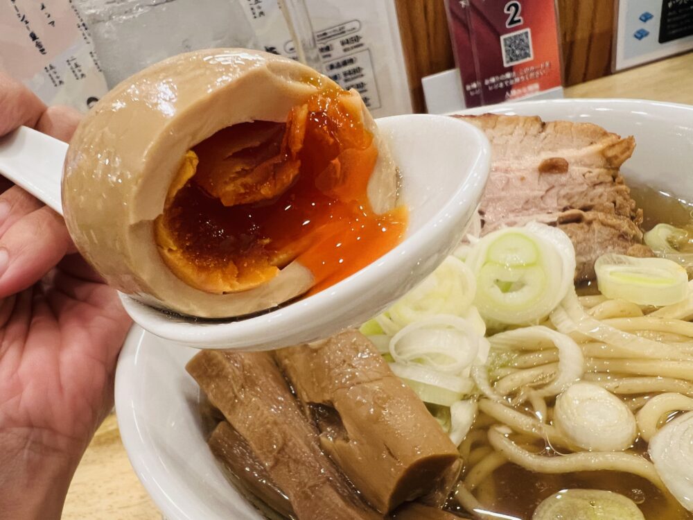 「特選こだわり煮卵」は半熟で、白身の中から黄身がとろ〜り。