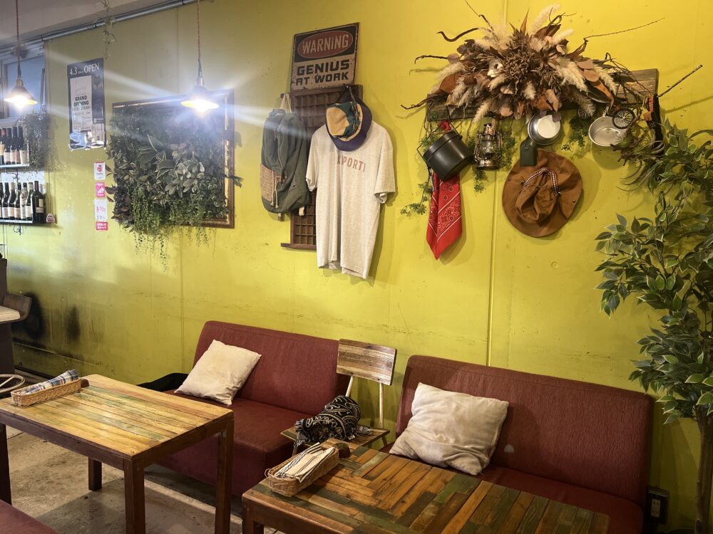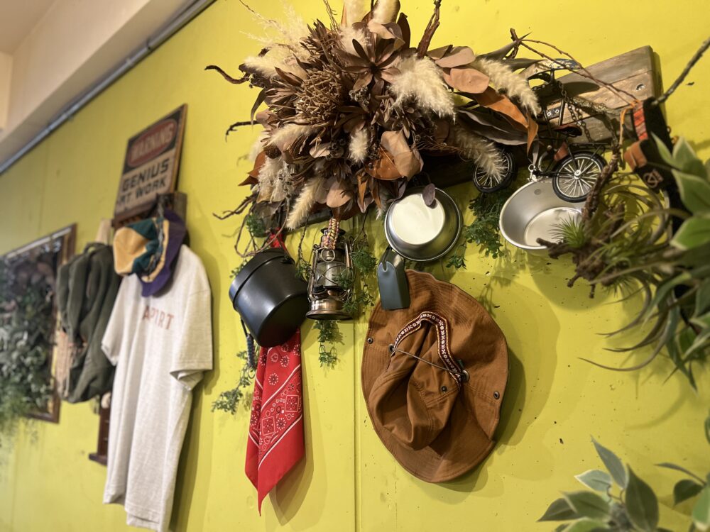壁には、キャンプ用品などがセンスよくディスプレイされています。