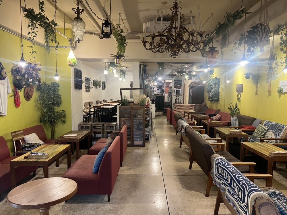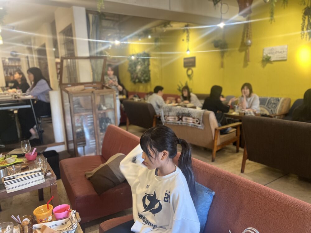 黄色の壁の前には、居心地の良さそうなソファとローテーブルがずらりと並んでいます。