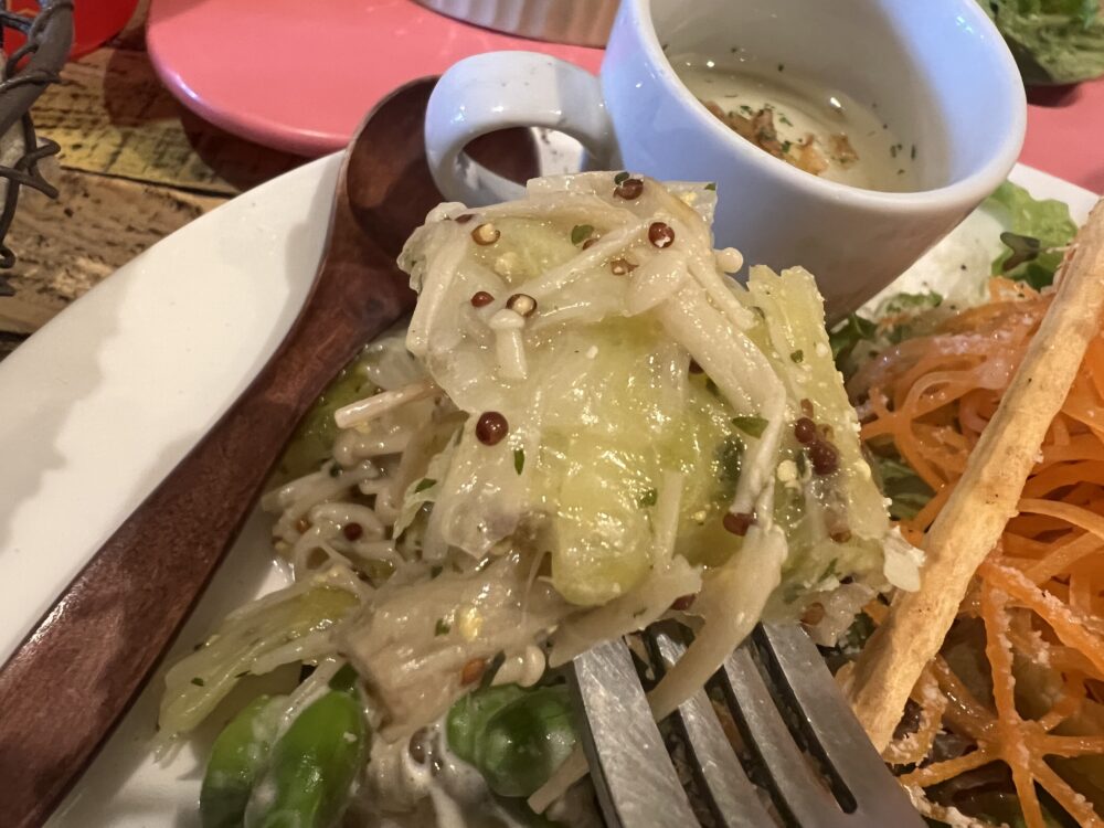 えのきとキャベツがソースで和えられた、こちらのお料理もおいしかったですよ。