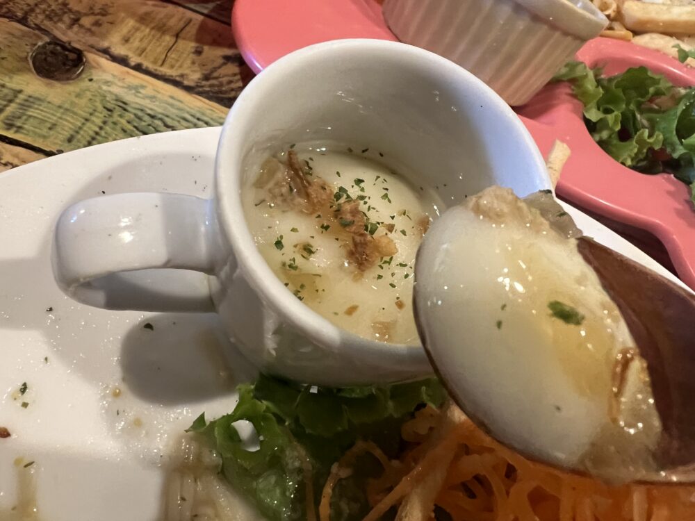 サラダのお皿にのっているのは、ポテトのミルク煮。