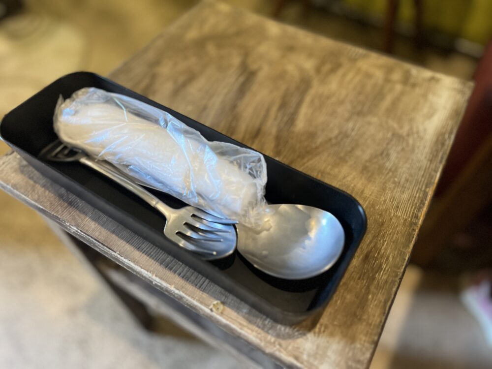 スタッフさんが「これからご用意しますね」と、何やらスプーンとフォークを乗せたミニテーブルを運んできました。