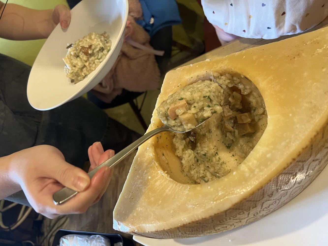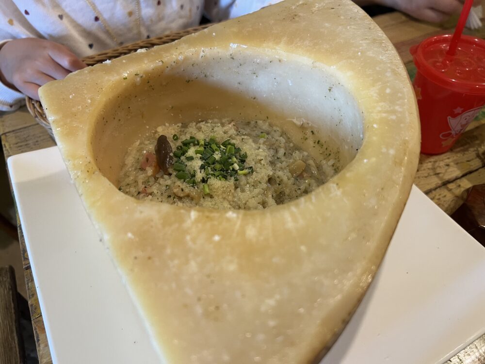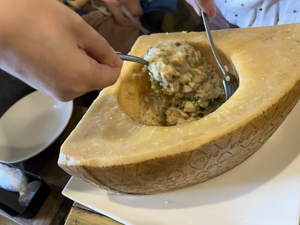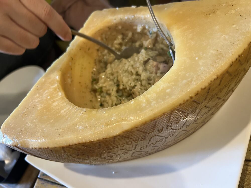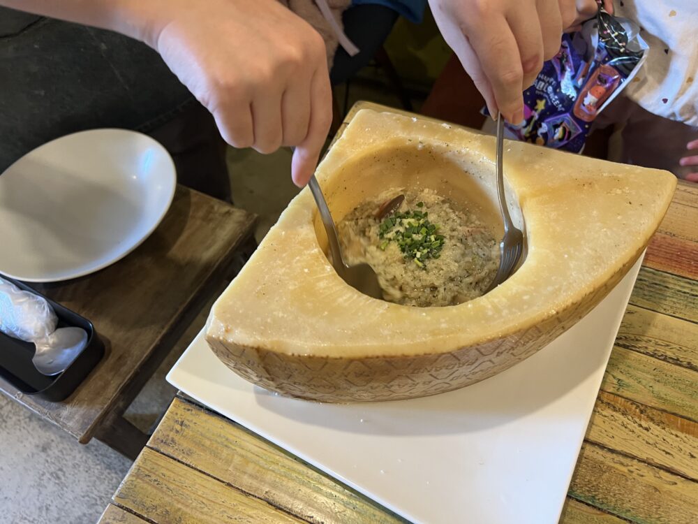 こちらのチーズの器は「パルミジャーノチーズ」という本物のチーズを使っていて、穴の内面を削りながら、チーズをリゾットに絡ませているんですって!!