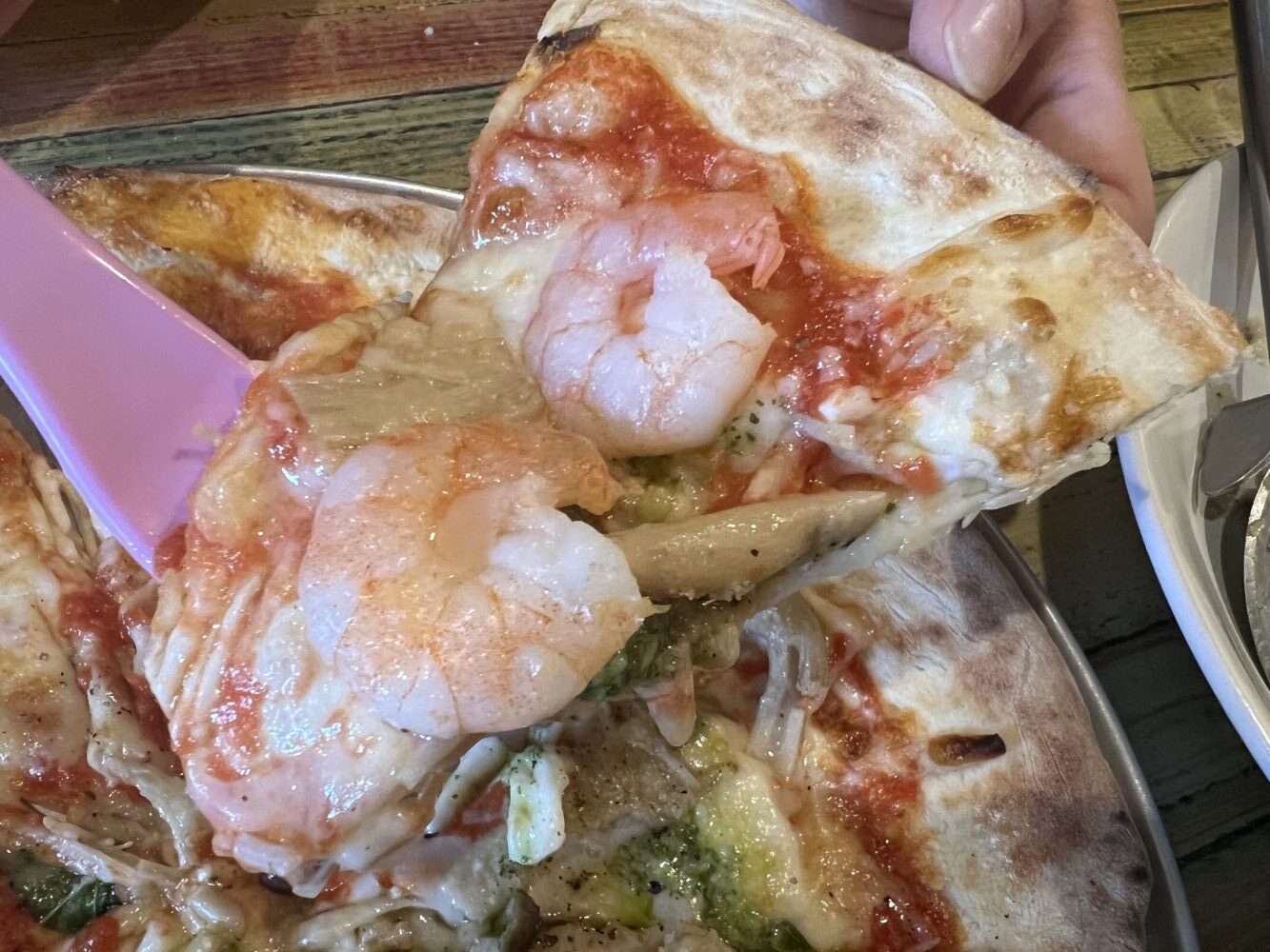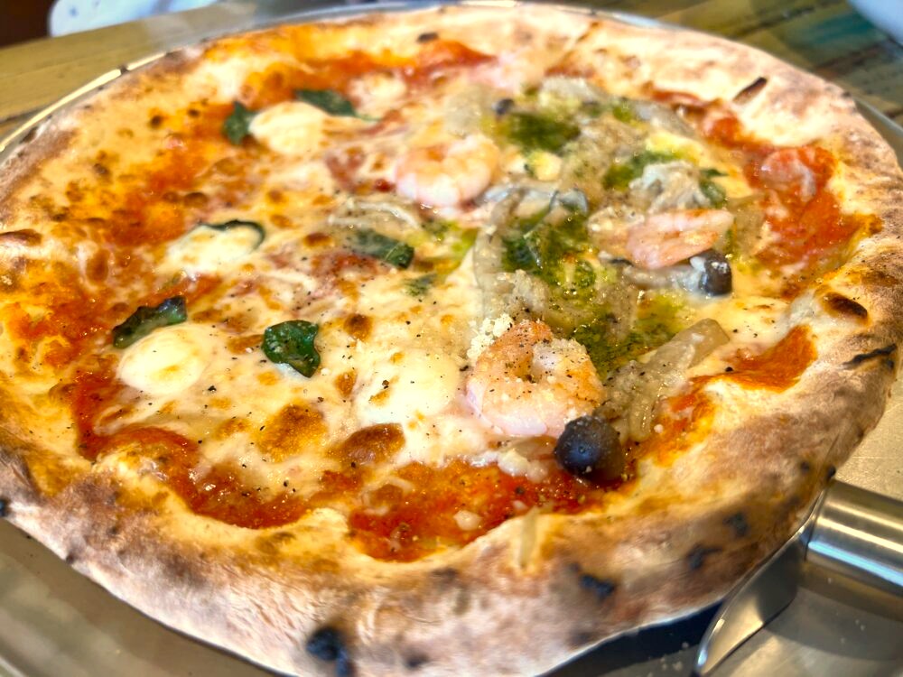 こちらのピッツァは、海老が本当にぷりっぷりで、チーズとキノコに絡まったジェノベーゼがいい感じに効いてておいしかったです♪