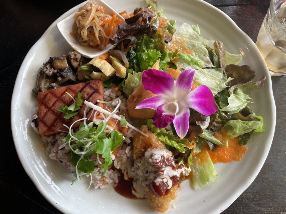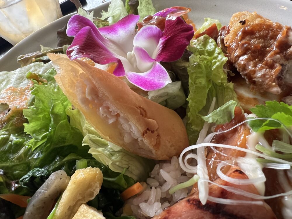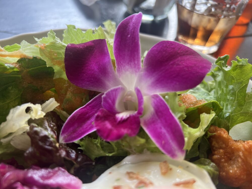 サラダにはかわいいお花が添えられていて、気分は一気にハワイアン。