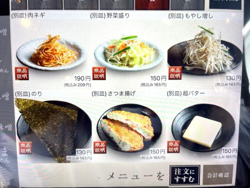今回は、+コーンバター 308円(税込)、味噌漬けめんま 176円(税込)、こな雪 165円(税込)マシマシトッピング!!