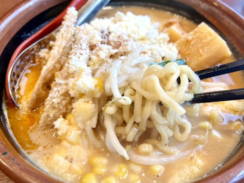 ツルツルのちぢれ麺が味噌スープとこな雪チーズに絡んでめちゃくちゃ濃厚です!!