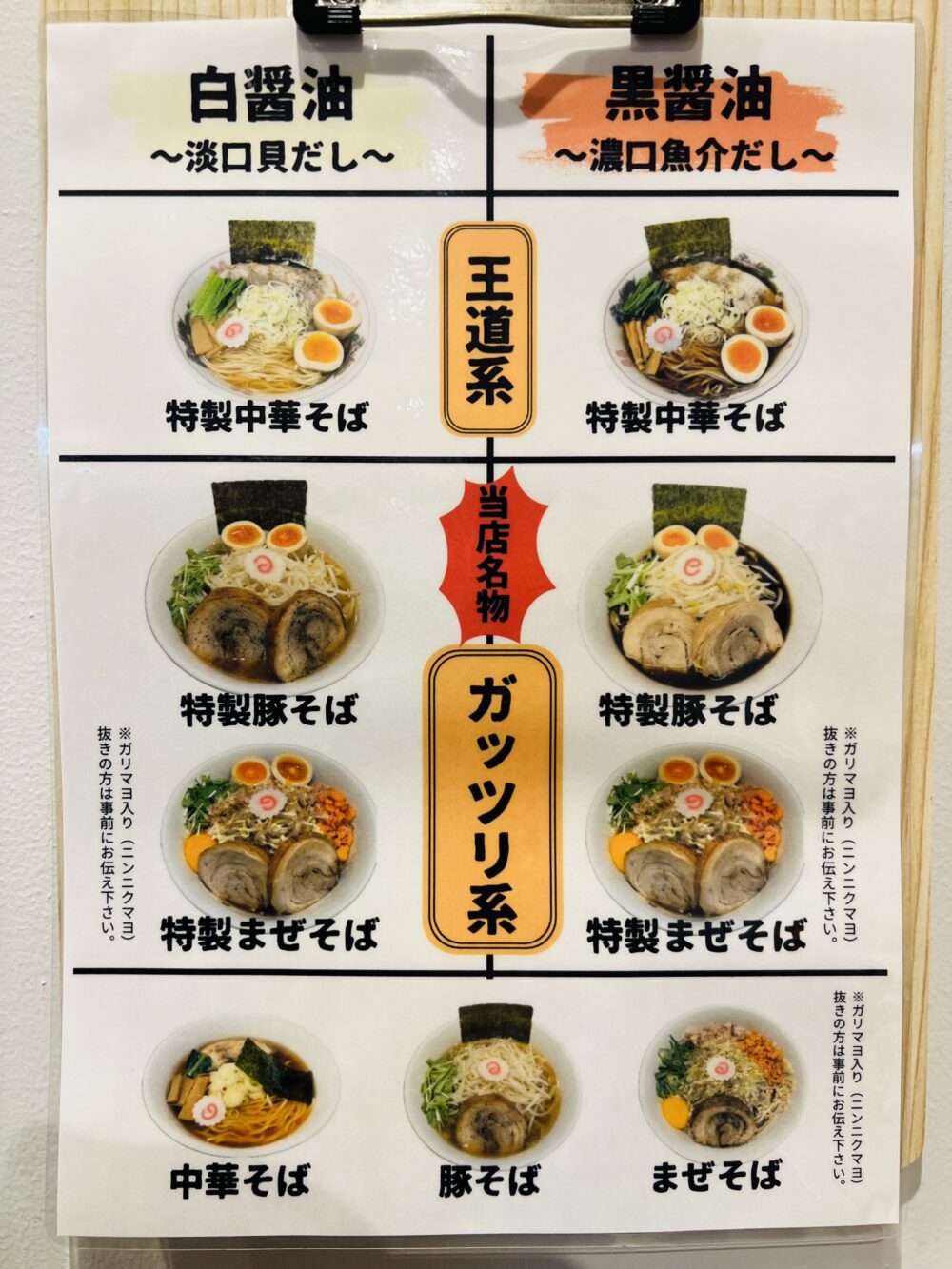 「黒醤油(鰹だし醤油)」と「白醤油(貝だし醤油)があり、それぞれ中華そば、豚そば、まぜそばがあるようです。