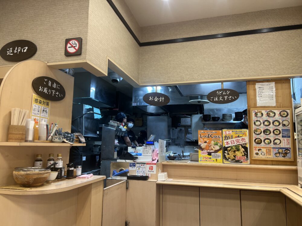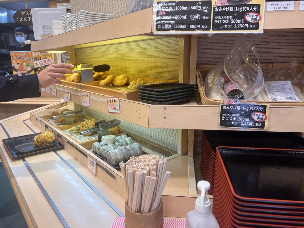 カリーノ江坂1階にある「本場さぬきうどん めりけんや 江坂店」。香川県に本社を置くセルフうどん店です。