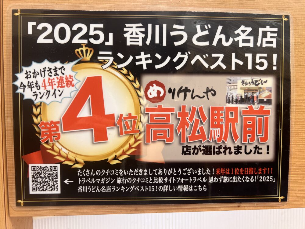 なんと!旅行口コミサイト「フォートラベル」の『香川うどんの名店ランキング ベスト15』で4年連続ランクインされているそうで、昨年も高松駅前店が第4位を獲得したそうです!