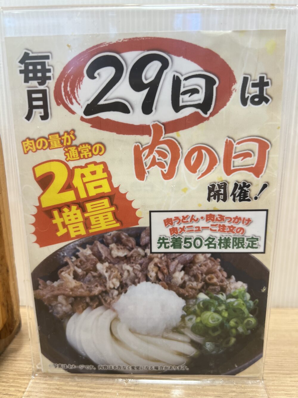 先着50名様限定で、「肉うどん」や「肉ぶっかけ」の肉の量が通常の2倍になるとのこと!!