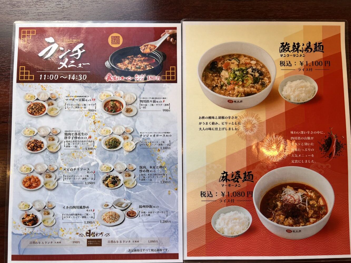今回は「酸辣湯(サンラータン)麺(税込1,100円)」にしてみましたが、こちらのお店の1番人気は「麻婆豆腐」だそうです!
