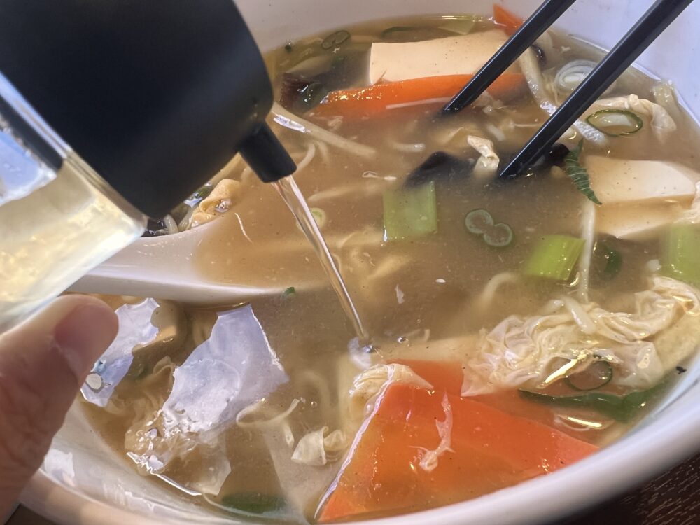 酢を足すとピリ辛スープが緩和され食べやすくなりました。