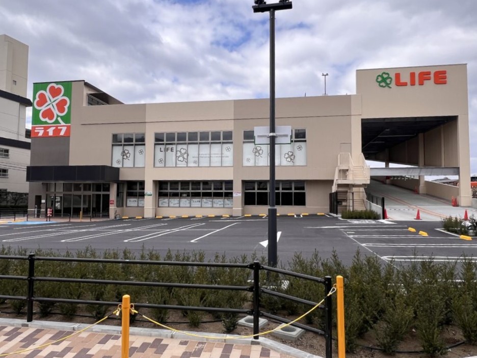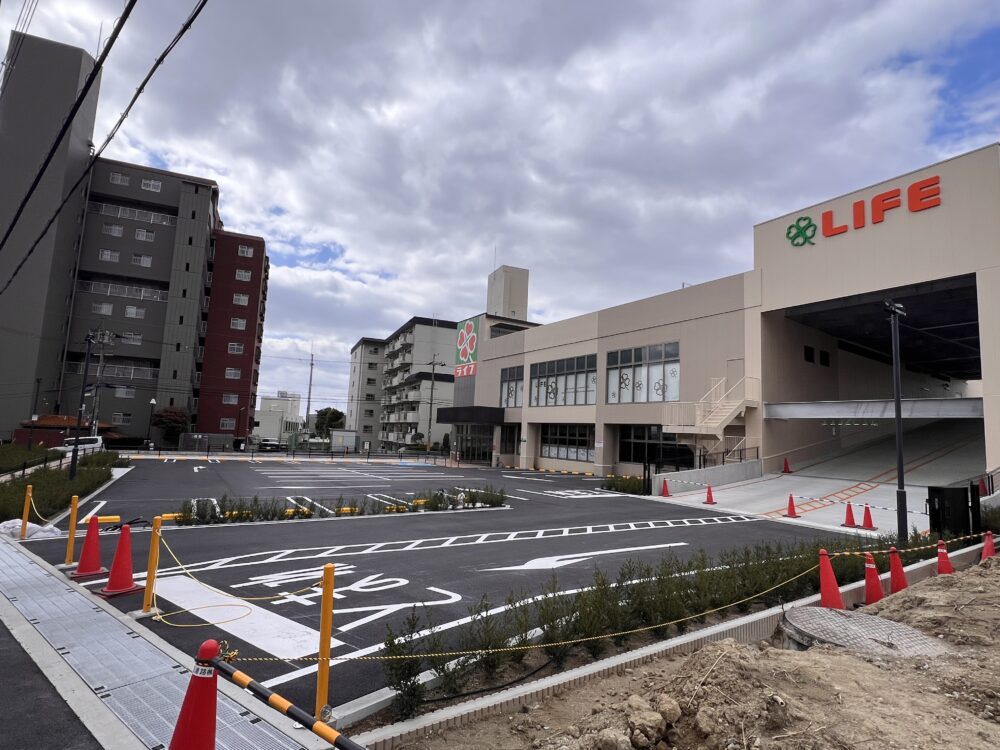 ちなみに、「くら寿司 江坂店」のある新御堂筋道路の向かい側には、今年の春オープン予定の「ライフ緑地公園店」がほぼ完成しつつあります。