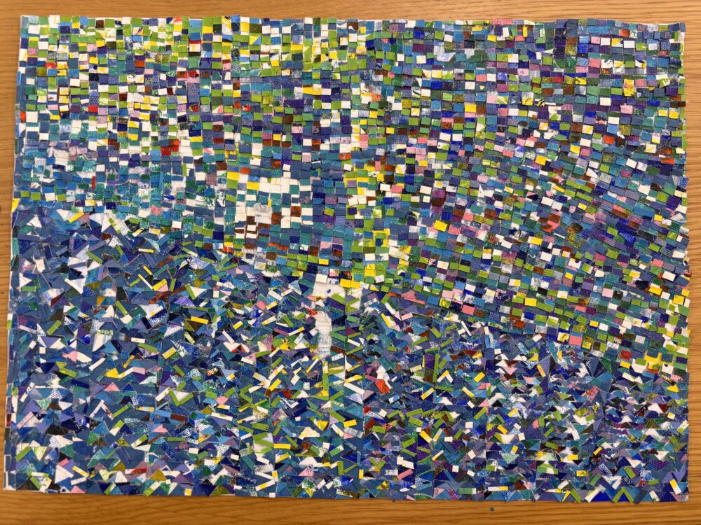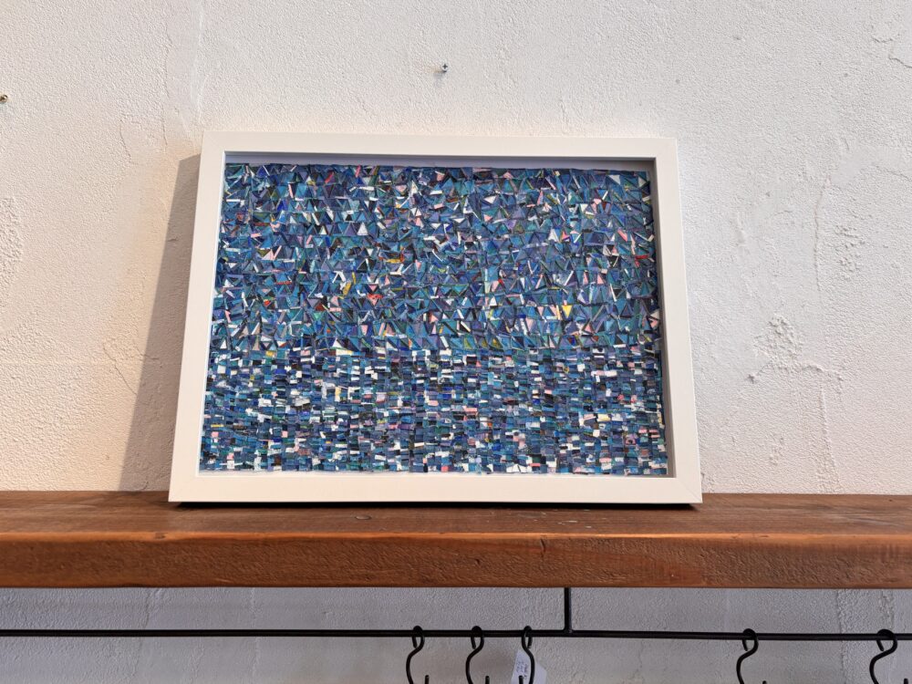 ボンドに塗料を混ぜて着色し、薄く平らにして固めたものを細かく切り貼りされている作品とお聞きしました☆ 職人さんのような丁寧さが光ります。