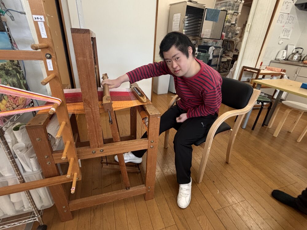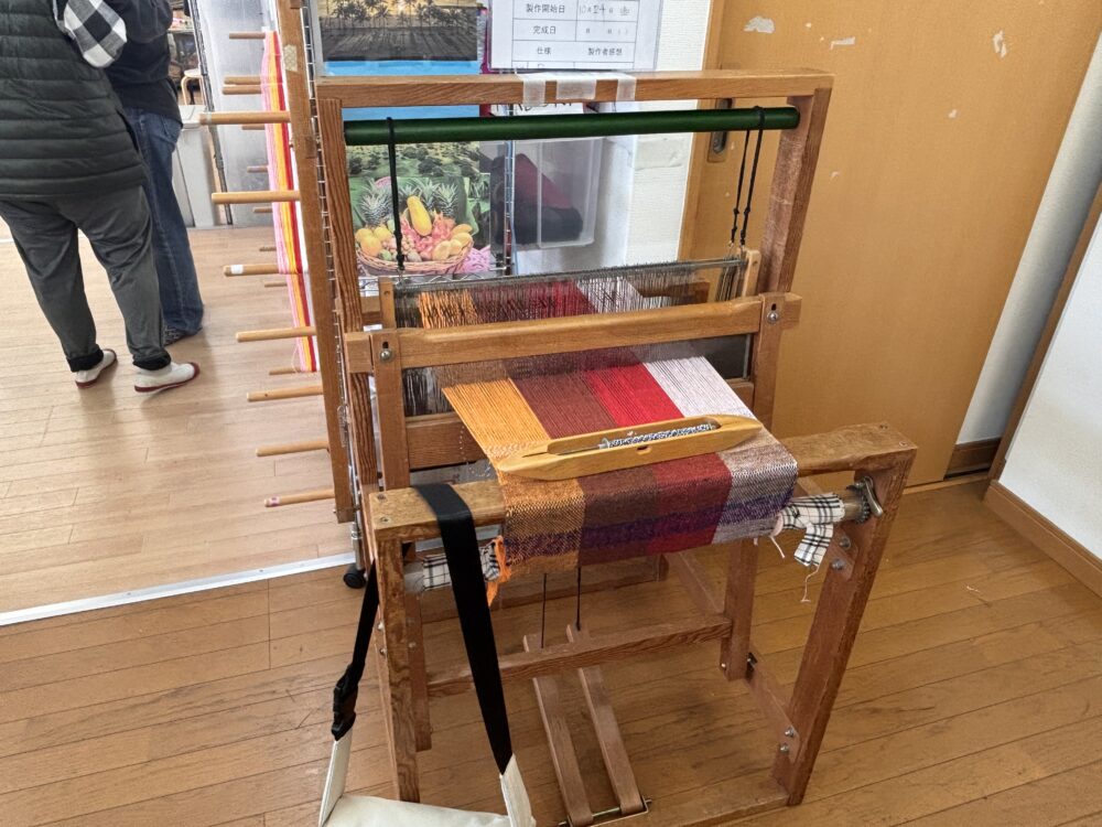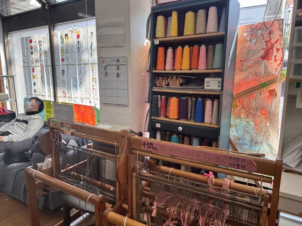 ここではどんな作業をされているのか、見させていただきました。「さをり織り」と自由な機織りなんですって。