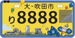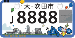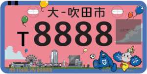 吹田市にホームスタジアムがある、ガンバ大阪オフィシャルマスコットの「モフレム」と吹田市のイメージキャラクター「すいたん」が、吹田の街をお散歩しているデザインのナンバープレートです。これは市民投票で決定したそう。
