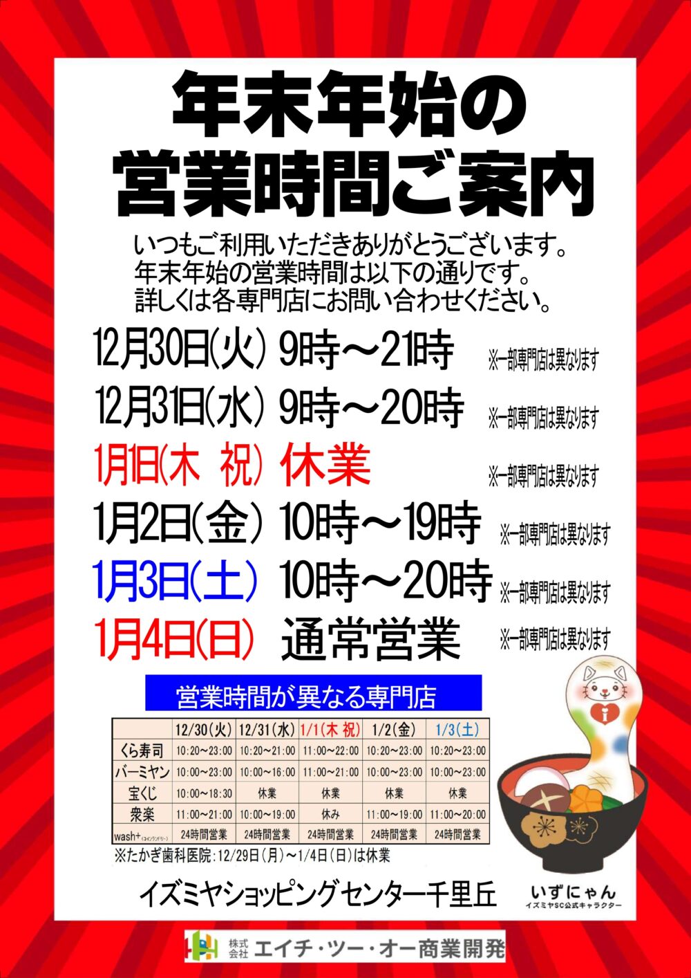 • 12月31日(水):9:00~20:00