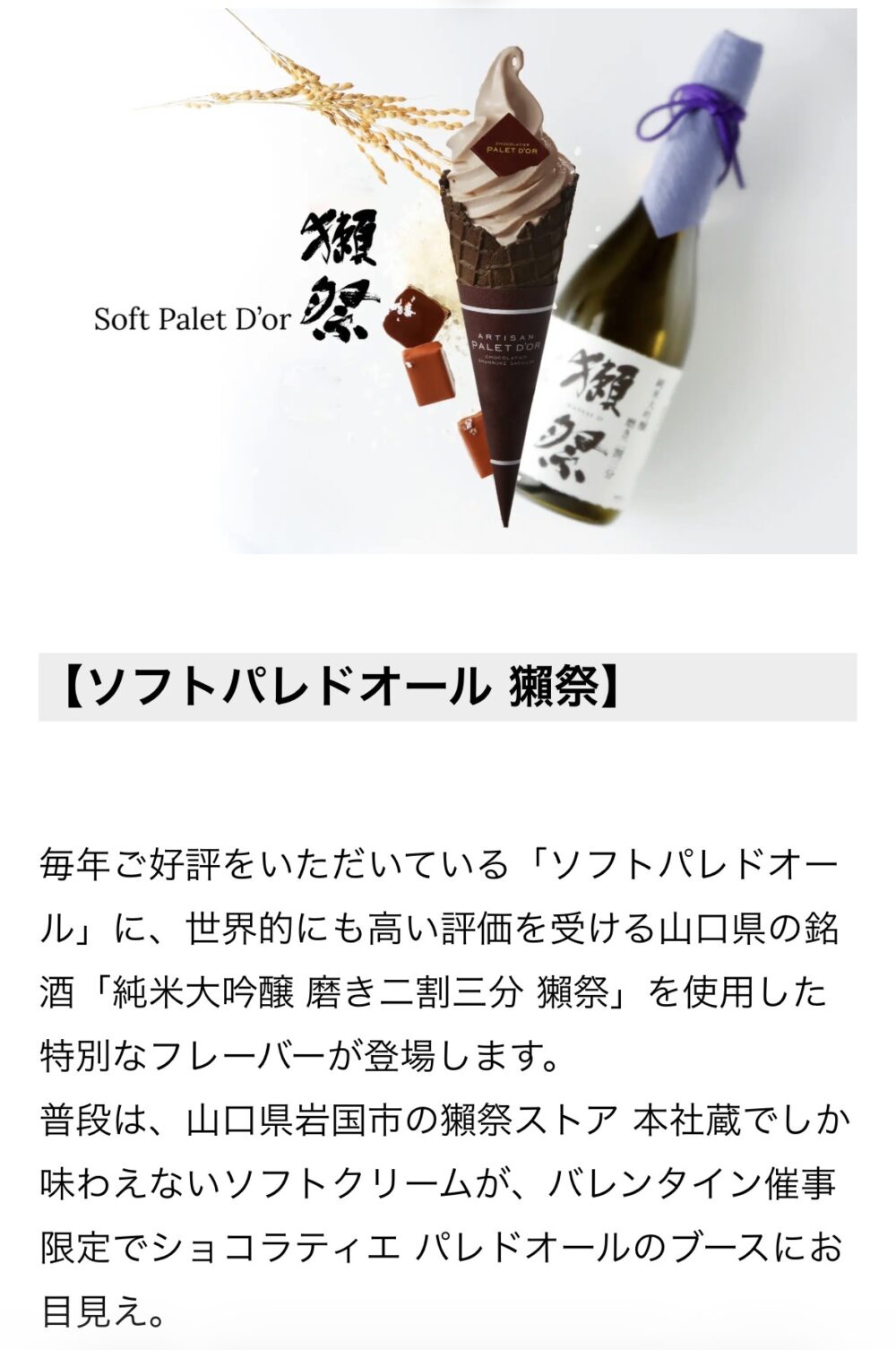 記事はこちら▶︎【ショコラティエパレードオール】獺祭ショコラがソフトクリームになってバレンタインに登場.