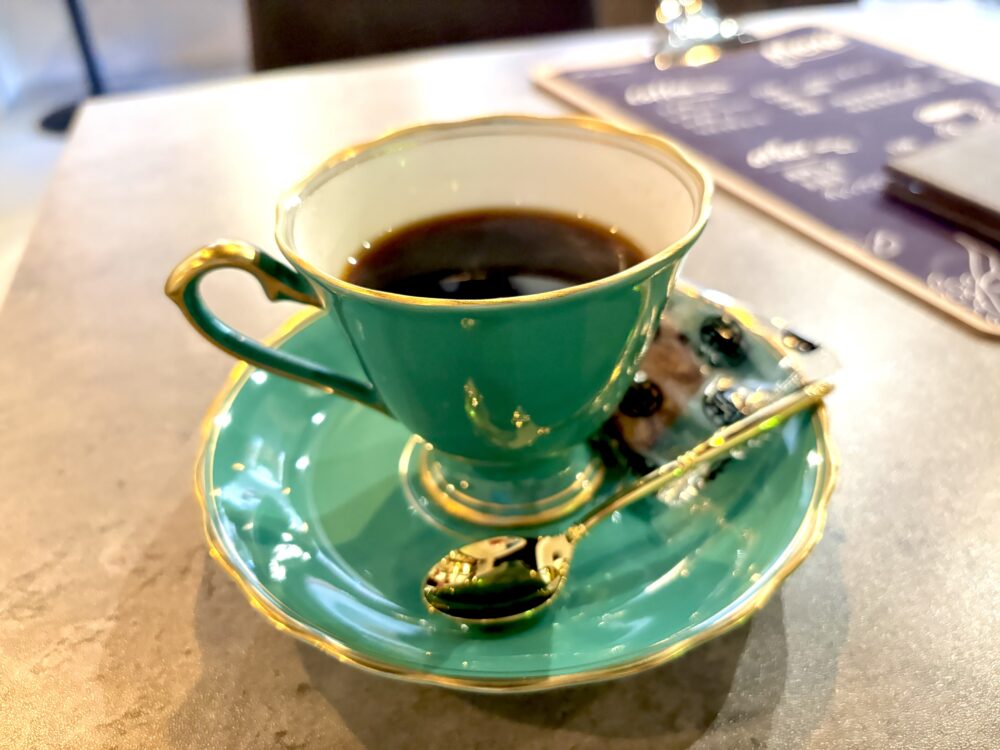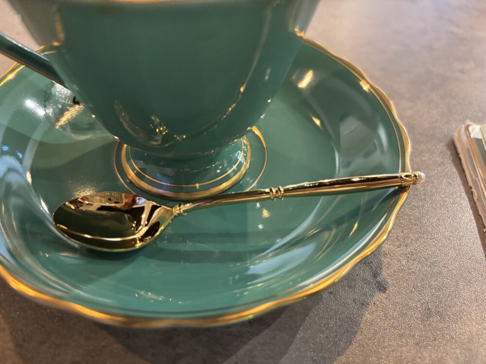 まずこのエメラルドグリーン×ゴールドのコーヒーカップに心躍りました(^^)