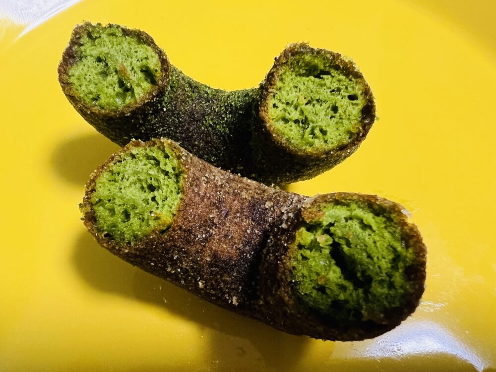 「抹茶きなこ」と「抹茶シュガー」の生地を半分に割ってみると、どちらも綺麗な緑色をしています。