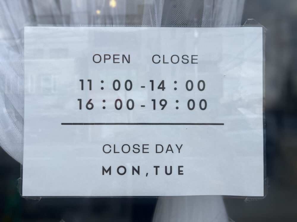 営業時間:11:00-14:00/16:00-19:00 ※日曜日は11〜14時のみ