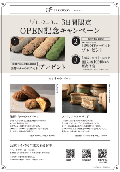 マドレーヌやバターサンドなど、焼き菓子を中心にしたスイーツがずらり!スイーツ好きにはたまらないラインナップです♡これは見逃せないオープン記念キャンペーンですね!