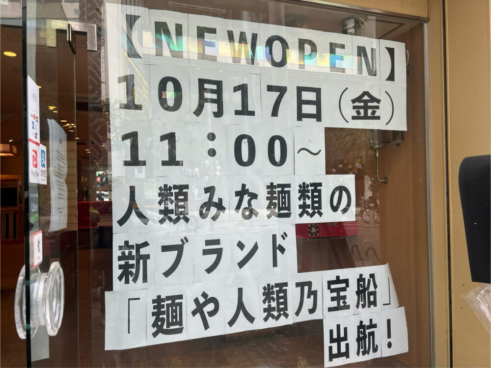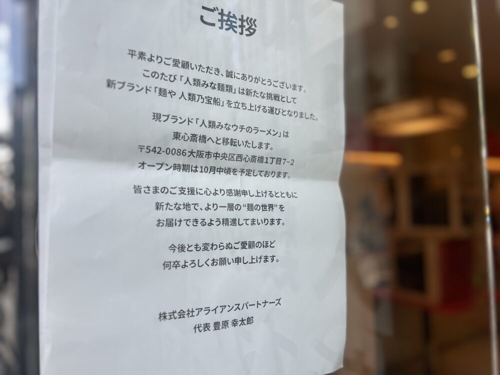 ここは、もともと歌手のmisonoさんとのコラボ店舗「人類みなウチのラーメン」があった場所ですが、こちらの店舗は東心斎橋に移転されたそうです。