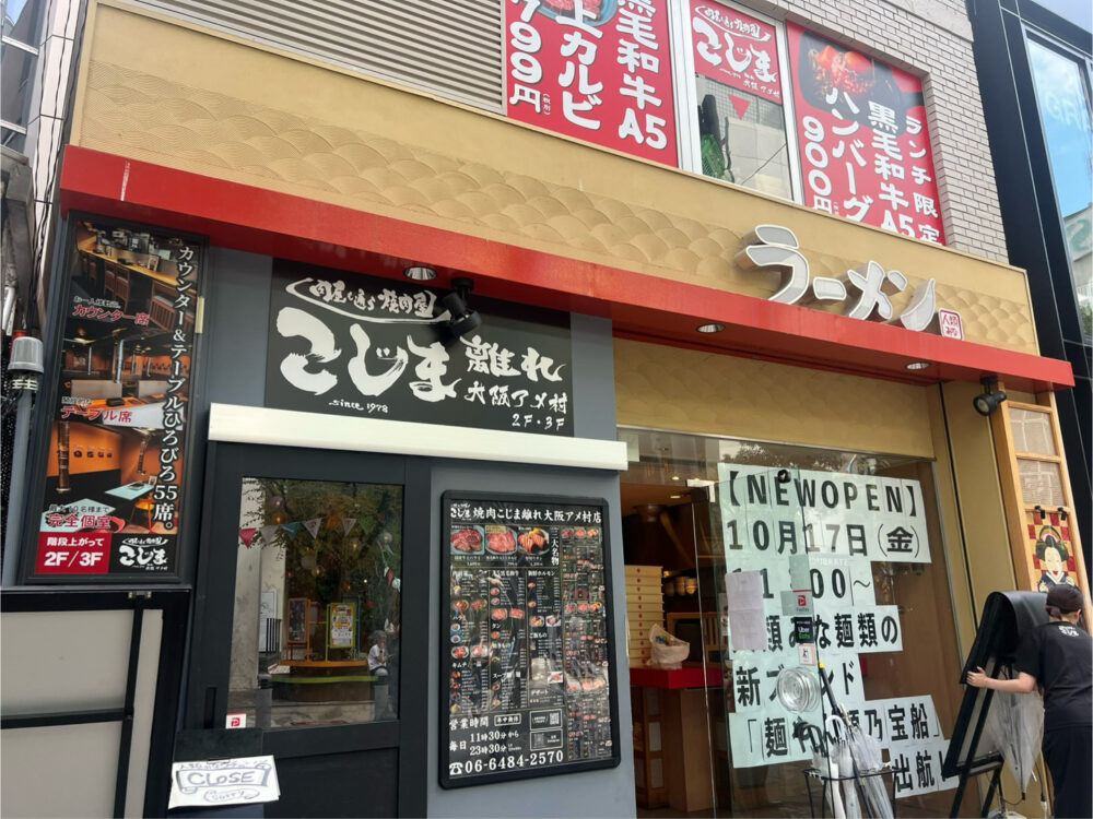 取材場所はこちら。2025年8月に江坂にもオープンした「焼肉こじま 離れ」のある建物の1階。「人類みな麺類」系列店の新ブランドができる、まさに直前でした!!