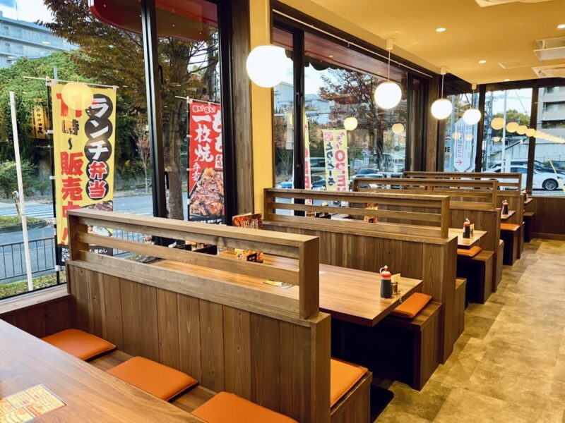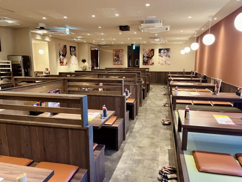 店内は座席数も多く、ベビーカーや車椅子での利用も問題ないくらいとっても広く作られていて、ボックス席26卓、座敷6卓を備えた全156席。