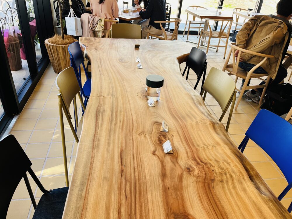入って一番手前の場所には、一枚板が印象的な7人掛けの大きなテーブル席がありました。