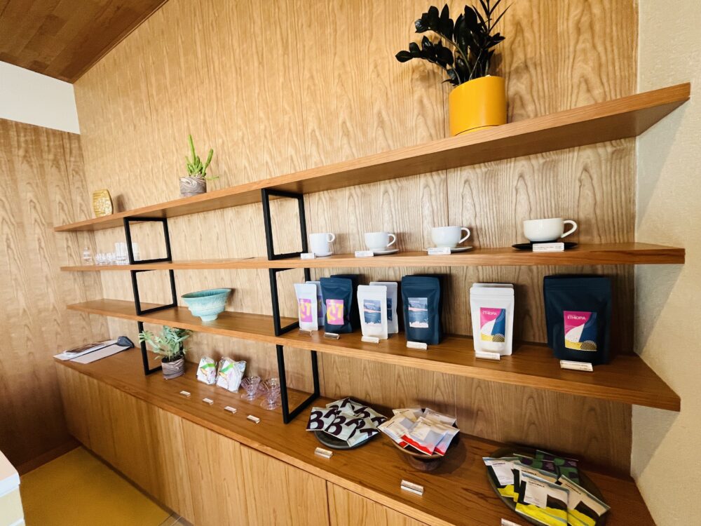 その横にはティーカップやコーヒー豆などが並ぶショップコーナー。