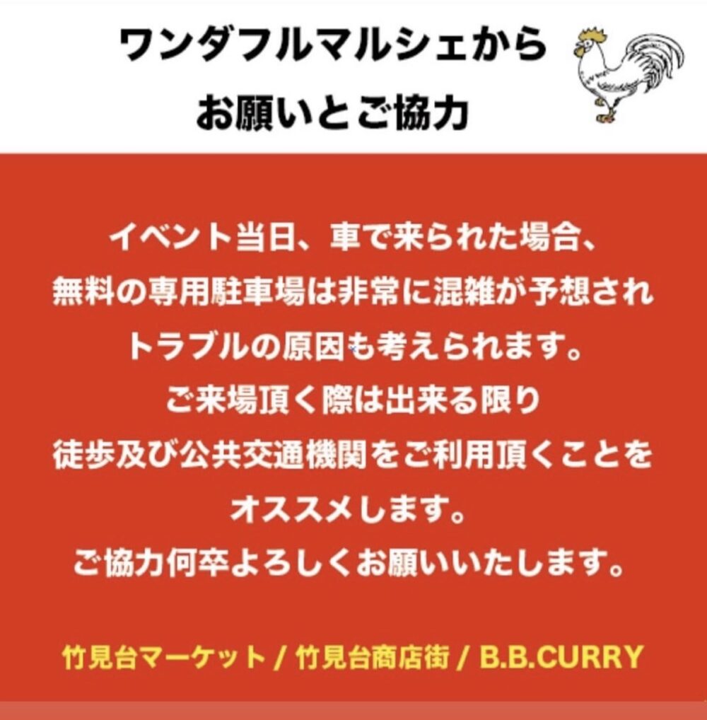 駐車場:※無料の駐車場は混雑が予想され、イベント当日はトラブルの原因になるので、極力公共交通機関をご利用くださいとのこと。お問い合わせ:090‑5136‑3339(B.B.CURRY:馬場さん)