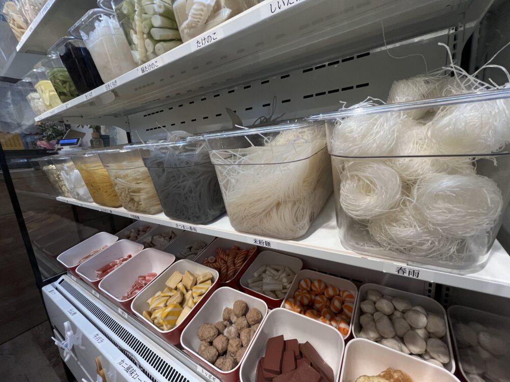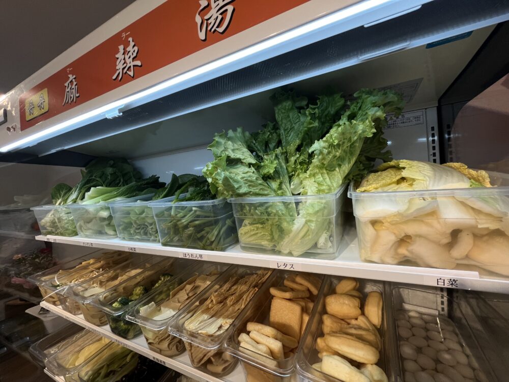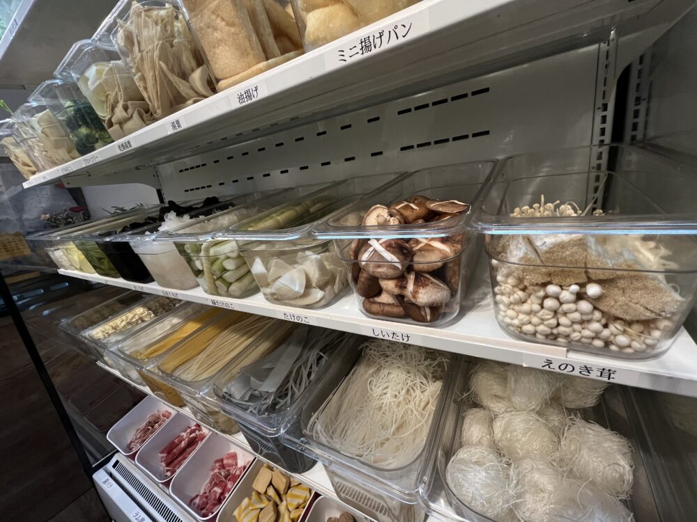 冷蔵ケースにずらりと新鮮野菜や具材が並び、見ているだけでも楽しいです。