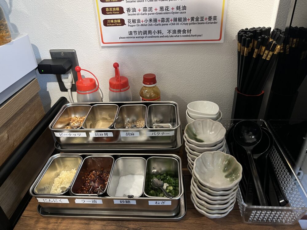 レジ横にパクチー、ニンニク、ピーナッツなどのトッピングコーナーも用意されています。
